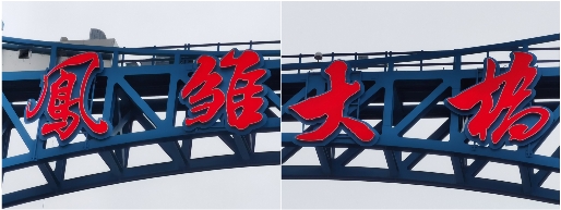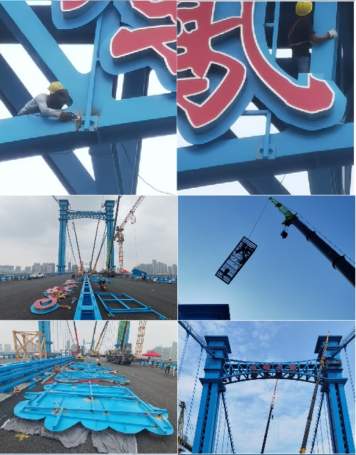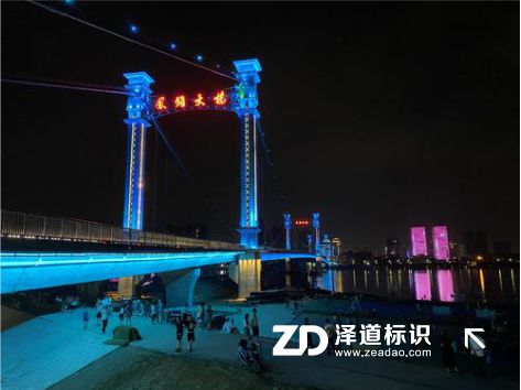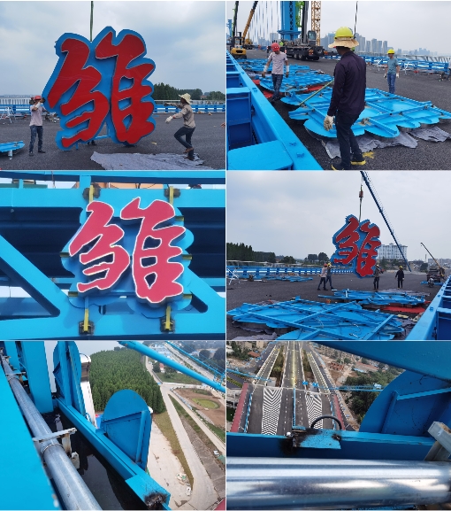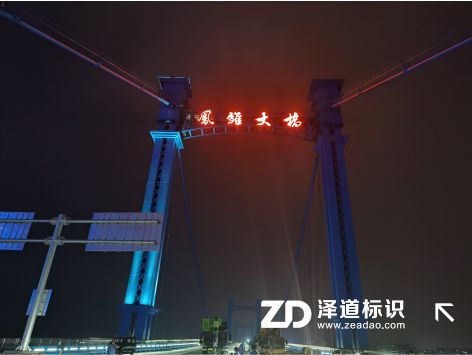 凤雏大桥是中国湖北省襄阳市境内过江通道,位于汉江水道之上,是汉江首座三塔式悬索桥、湖北省继鹦鹉洲长江大桥后的第二座三塔式悬索桥。凤雏大桥于2015年10月28日动工,于2020年6月24日通车运营,并举行通车仪式 。凤雏大桥南起庞公路,上跨汉江水道,北至大庆东路;线路全长2603.863米,桥梁总长2023.038米;桥面为双向六车道城市主干道,设计速度60千米/小时 。我司承建了该大桥的桥铭牌发光字项目,改发光字采用1.5mm304不锈钢制作壳体,欧司朗LED模组,5毫米台湾瑞昌亚克力面板,设计使用寿命10年。由于大桥桥墩横梁为镂空结构,为增加铭牌的醒目度,在字背后特衬托一块2mm不锈钢底板,沿着字轮廓外扩10公分,效果立竿见影。